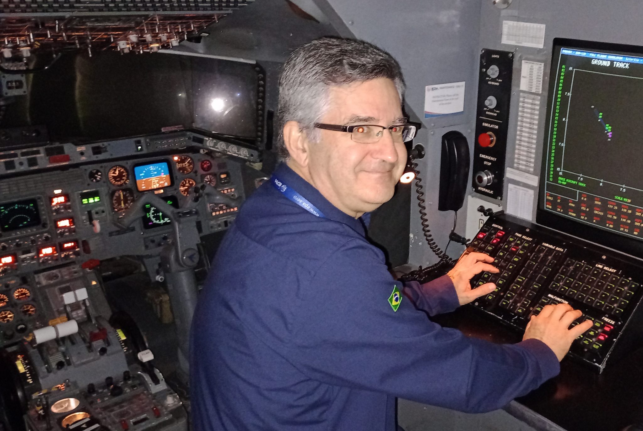 Na foto, Sady em frente ao painel de controle do simulador, onde o instrutor seleciona as condições climáticas (vento, visibilidade, teto, etc) e também as diversas panes nas quais os pilotos serão treinados/avaliados.