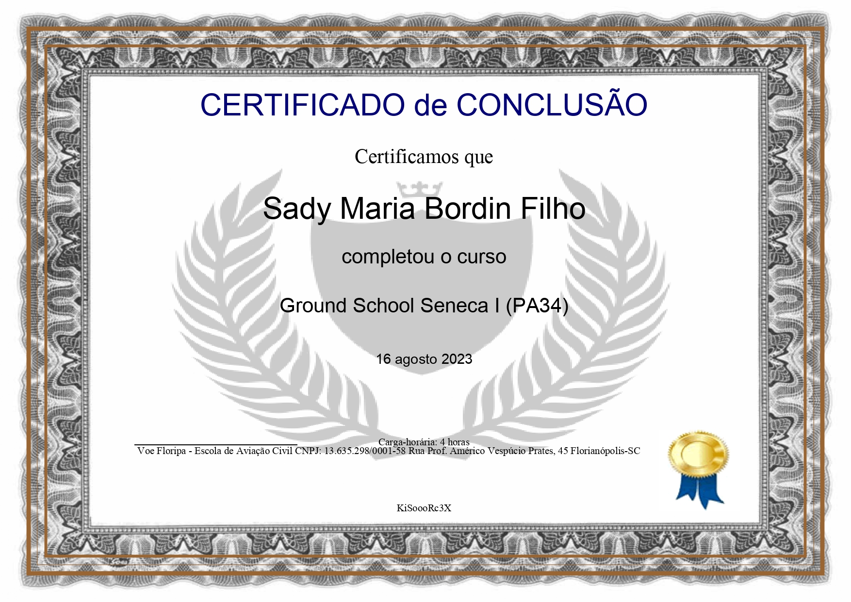Certificado de conclusão do Ground-School do PA34 Seneca.